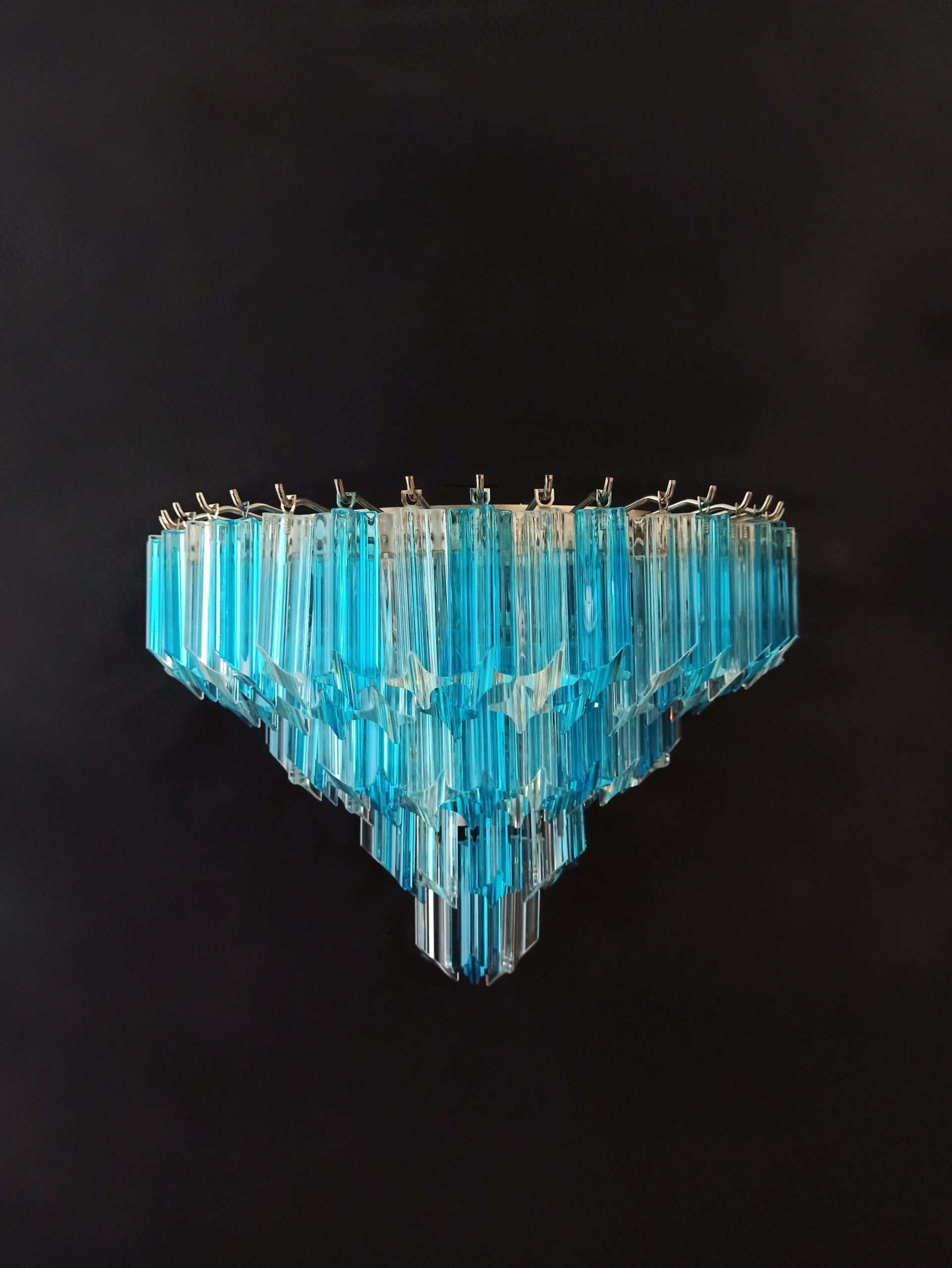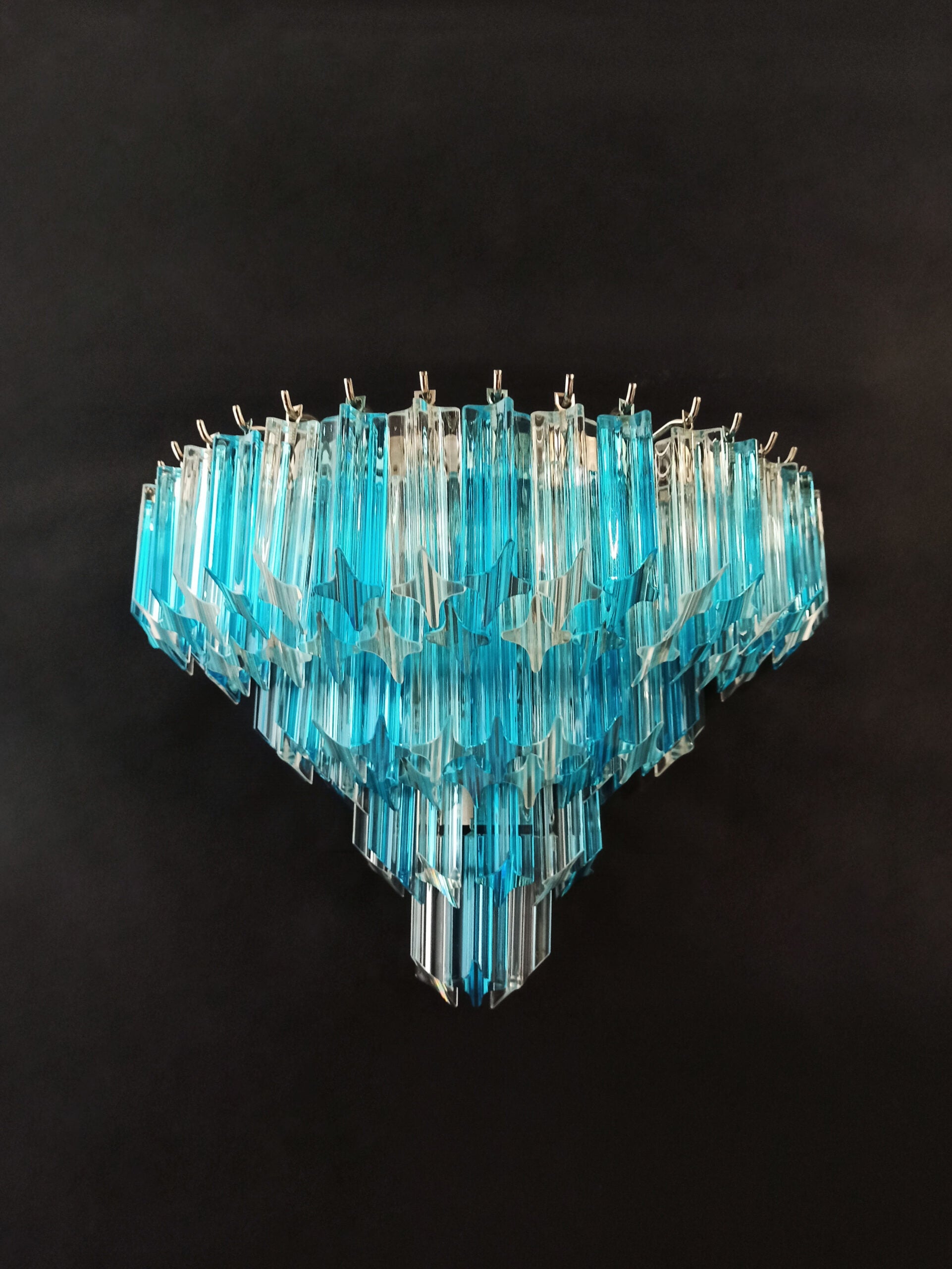 Dette mesterverket av en italiensk vegglampe er prydet med 63 Klare Blå Prismeformede Murano-glass. Med sine 63 håndblåste glass vil denne vegglampen utvilsomt være et blikkfang i ethvert rom den plasseres i. Rammen kommer standard i sølv patinert kromfarget (som på bildene), men kan også fås i matt gull, skinnende gull og skinnende krom.