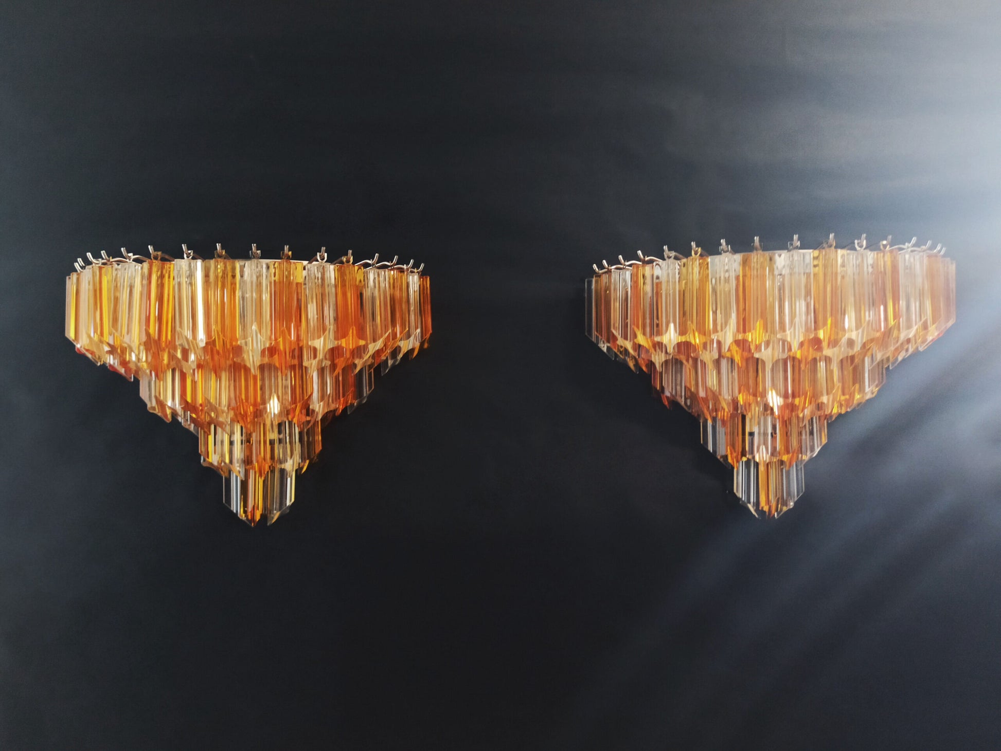 Dette mesterverket av en italiensk vegglampe er prydet med 63 Klare Gule Prismeformede Murano-glass. Med sine 63 håndblåste glass vil denne vegglampen utvilsomt være et blikkfang i ethvert rom den plasseres i. Rammen kommer standard i sølv patinert kromfarget (som på bildene), men kan også fås i matt gull, skinnende gull og skinnende krom.