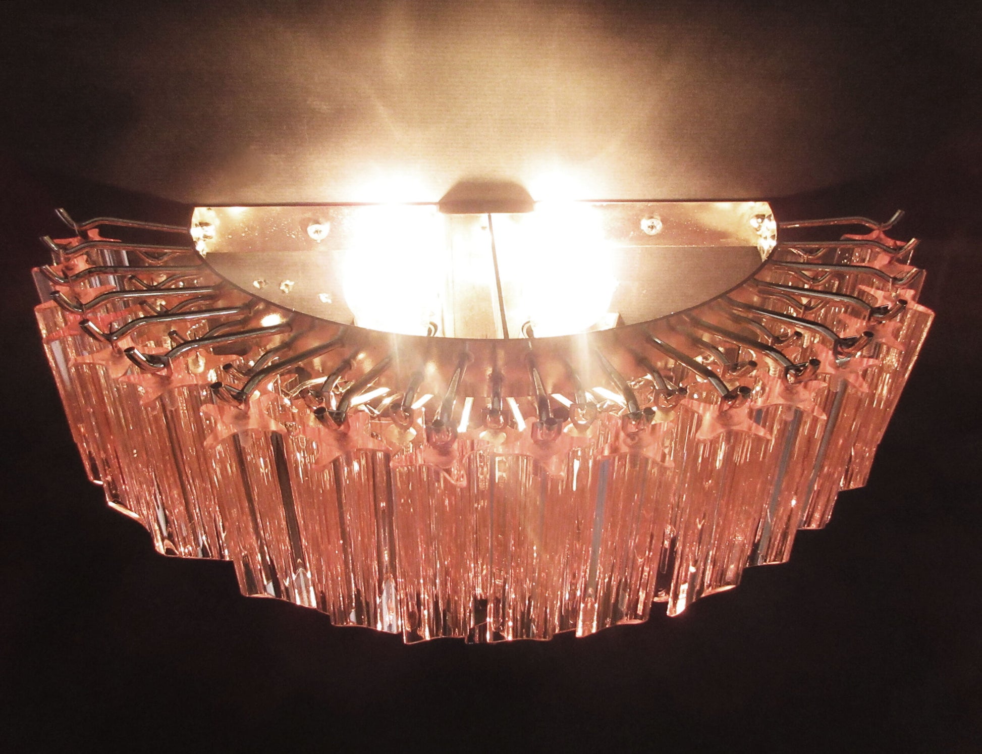 Dette mesterverket av en italiensk vegglampe er prydet med 63 Rosa Prismeformede Murano-glass. Med sine 63 håndblåste glass vil denne vegglampen utvilsomt være et blikkfang i ethvert rom den plasseres i. Rammen kommer standard i sølv patinert kromfarget (som på bildene), men kan også fås i matt gull, skinnende gull og skinnende krom.